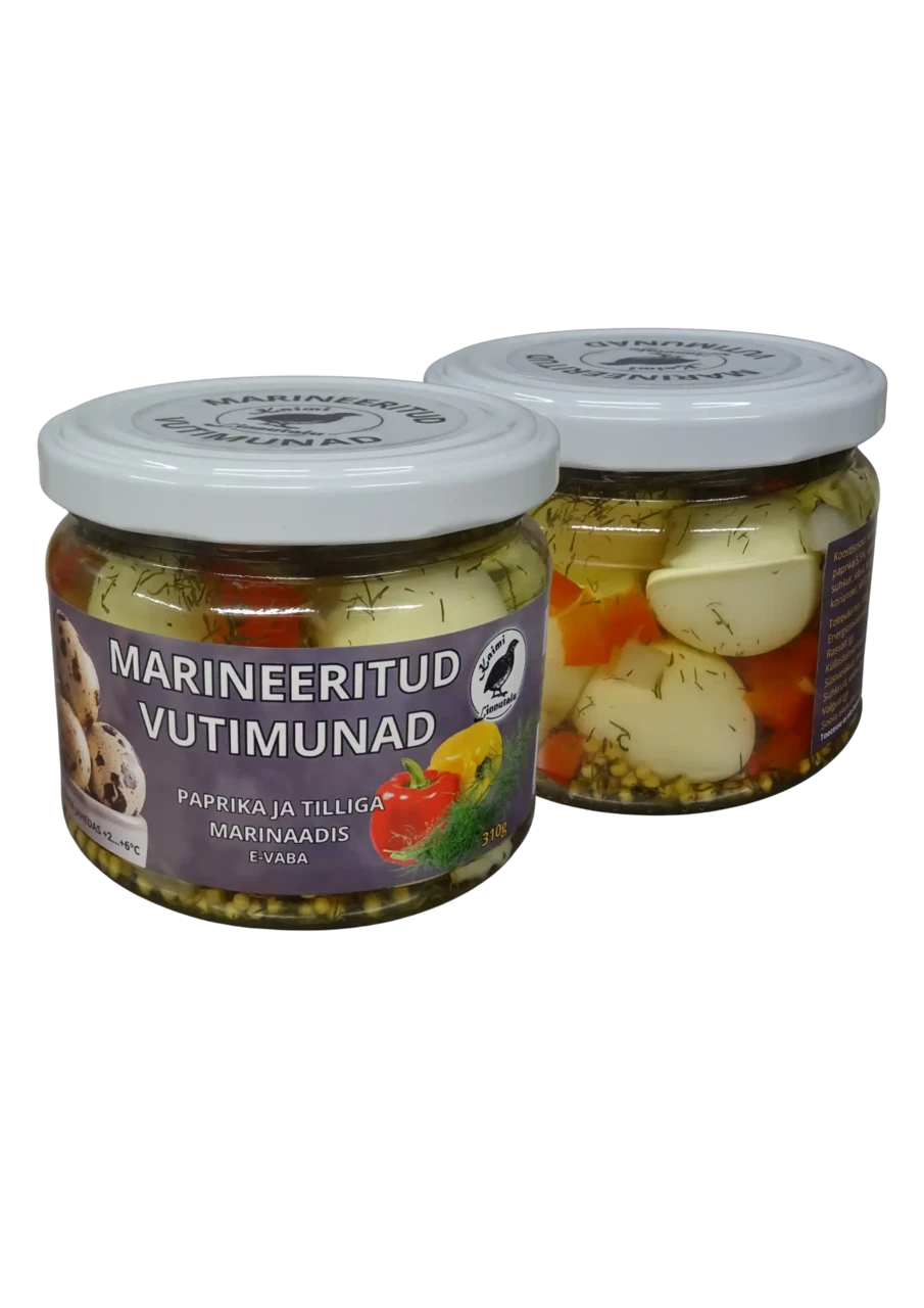 Keedetud vutimuna 55%, vesi, paprika 5,5%, äädikhape (vesi, äädikhape), sool, suhkur, sibul, küüslauk, sinepiseemned, koriander, till 0,5%