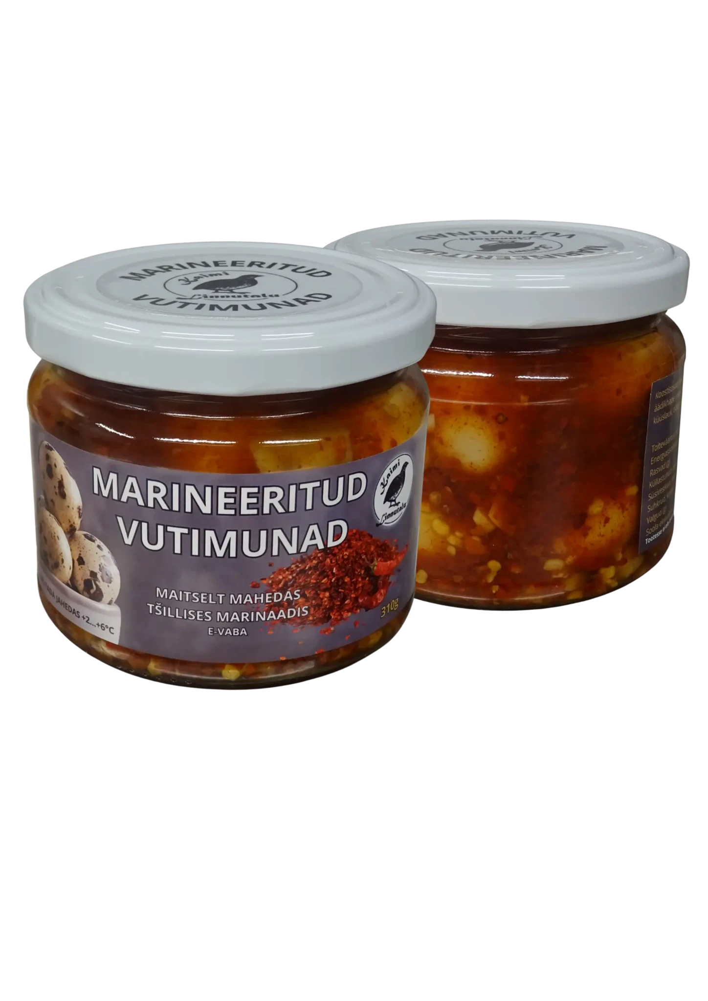 Keedetud vutimuna 55%, vesi, äädikhape (vesi, äädikhape), sool, suhkur, sibul, küüslauk, tšilli, nelk, loorber